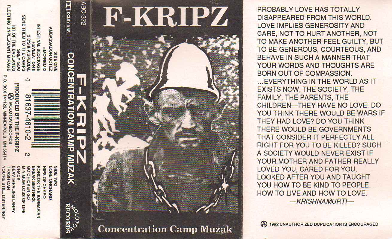 1992 saw the appearance of two conjoined releases; in the process of recording the more conventional rap numbers for Envy the Dead, we found that we were taking a lot of pleasure in these instrumental tracks too, whether dancey or more meditative.  Thus was born the idea of a dual release; the latter cuts made up Concentration Camp Muzak.  Much of this was written and programmed at the Troost Palace in Kansas City; the recording and mixing happened at Studio K East in Pennsylvania, with the help of Handy Dan (so named for both his crash course in running a board and his ability to perform quick improvisational repairs on the VW bus that got us out there).  Dallas Poague contributed the cover art for this and for Envy the Dead.  Track listing is as indicated above.  Tracks follow.
