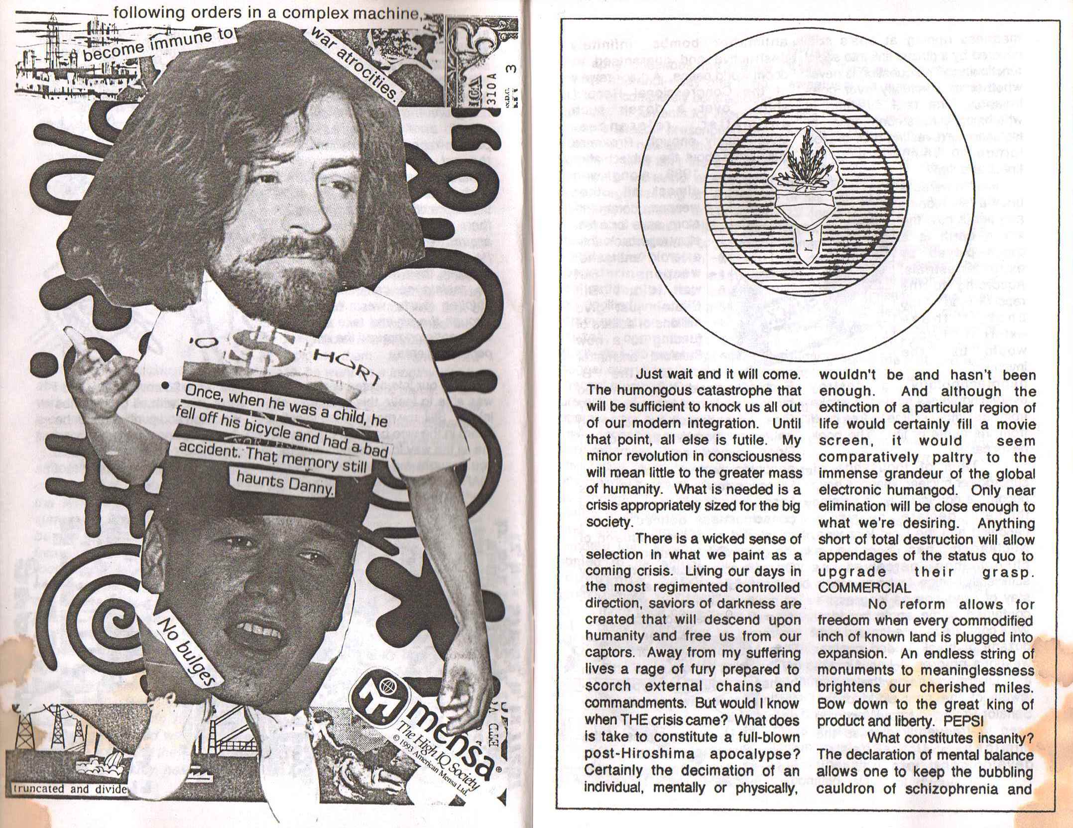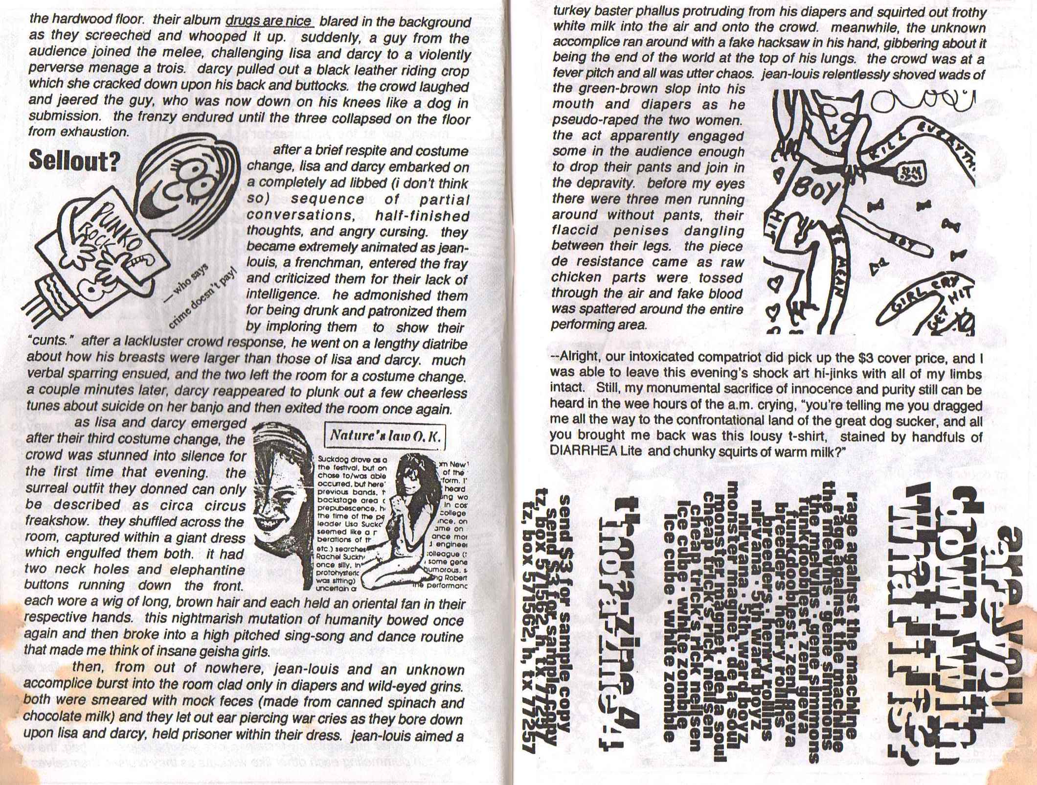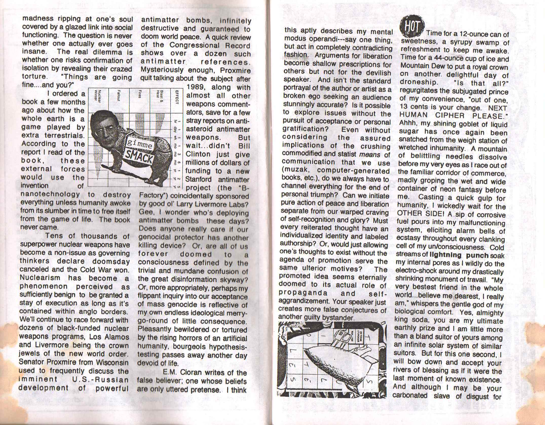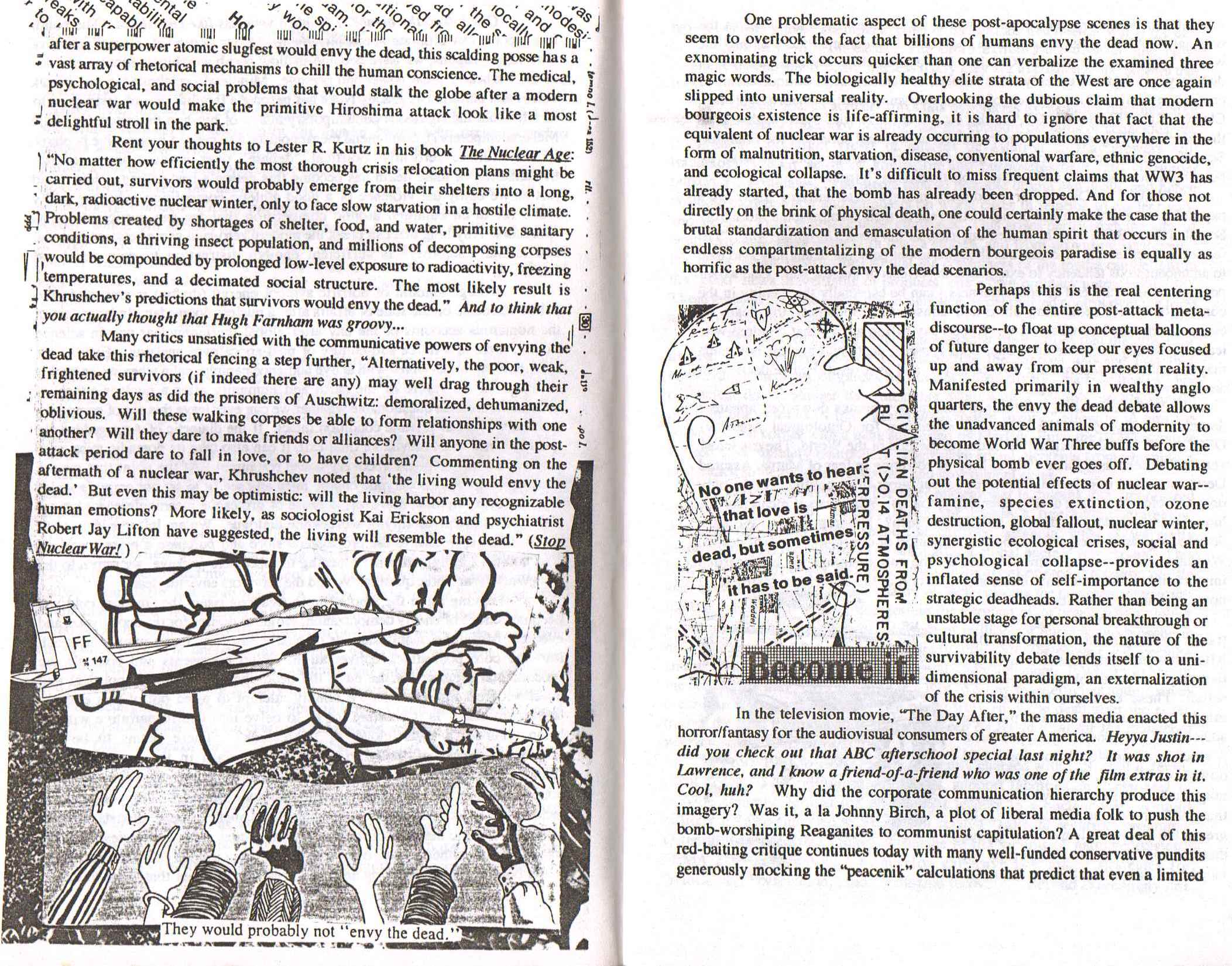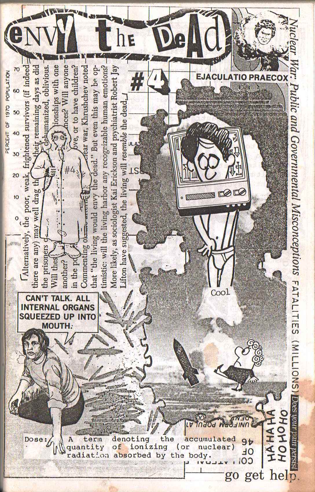Envy the Dead, Volume 4 was the last of the zines, and it was truly an epic undertaking. Aside from the sheer amount of writing and collaging necessary to flesh out its loosely thematic content (much of it concerned with nuclear holocaust), an extended collating and stapling session around the dining room table — with a crew including Monsieur and the Slickery Eel — remains a memorable stage of its production. Exhorting the reader, “for the sake of peace and stability in Central America…[to] stop the emerging women of country music from crossing over into hip-hop necrophilia,” this, the chunkiest ETD ever, weighed in at nearly 80 pages — not including the Fucksheet Five insert! — and offered “a most unpleasant, unpaginated sensory experience,” indeed.