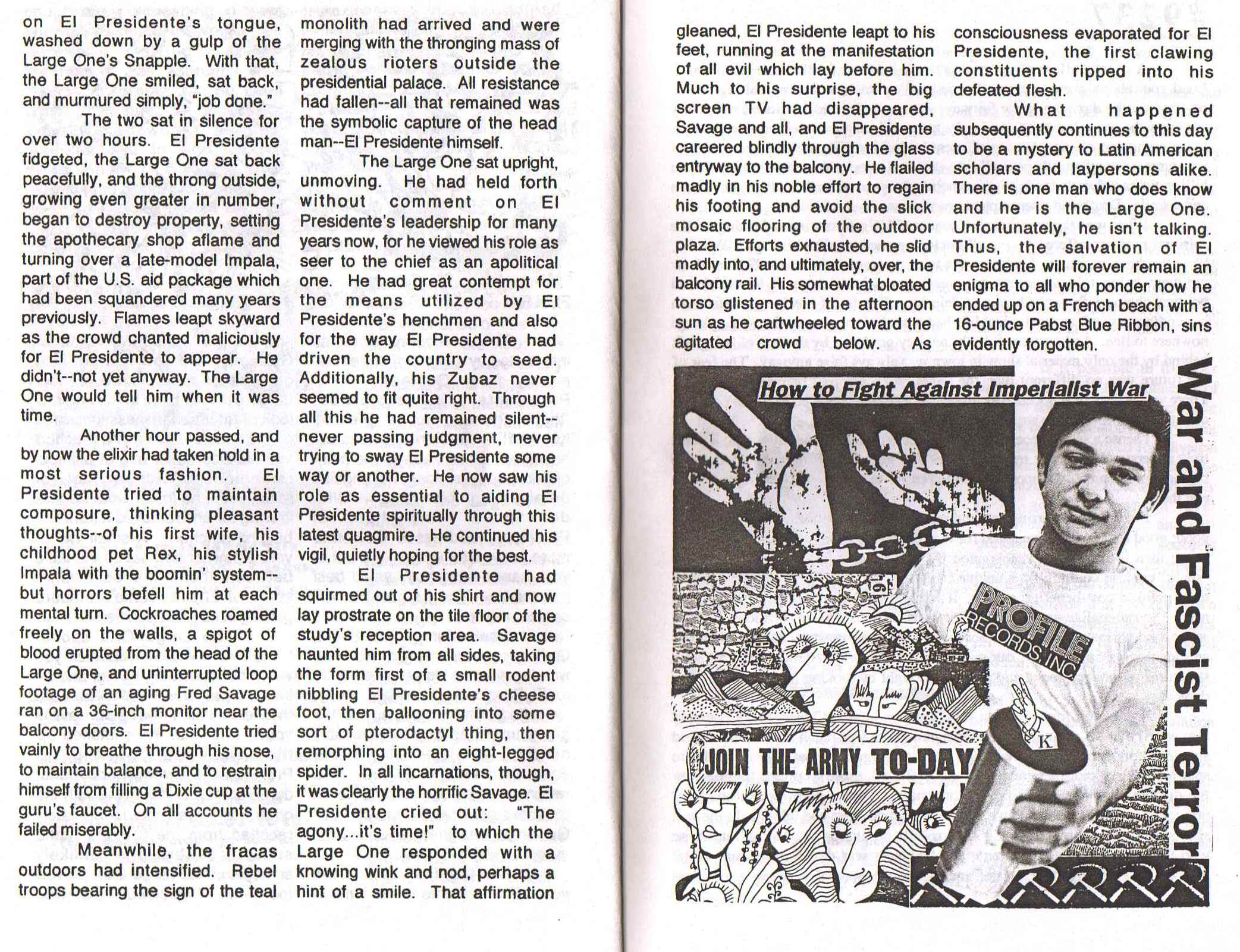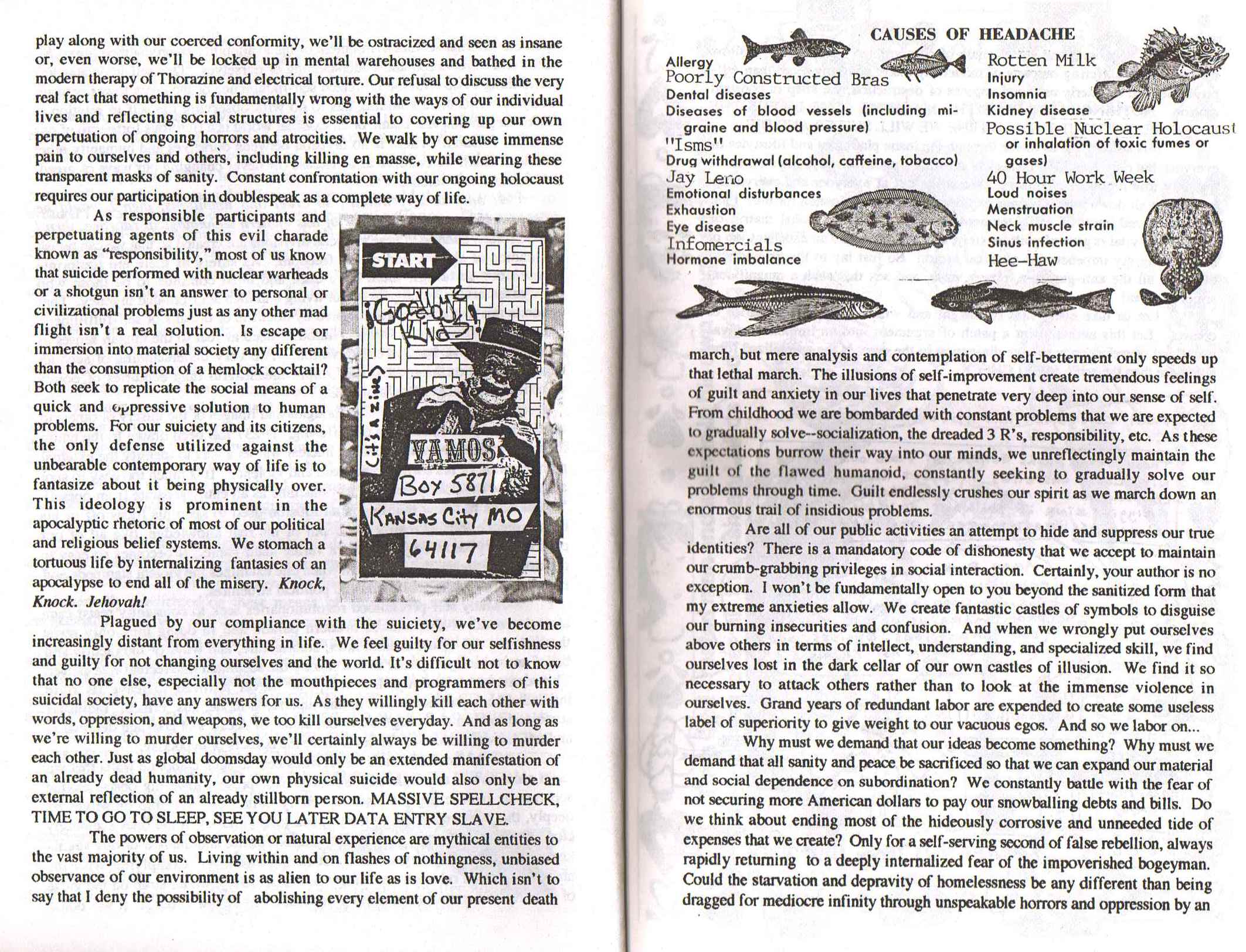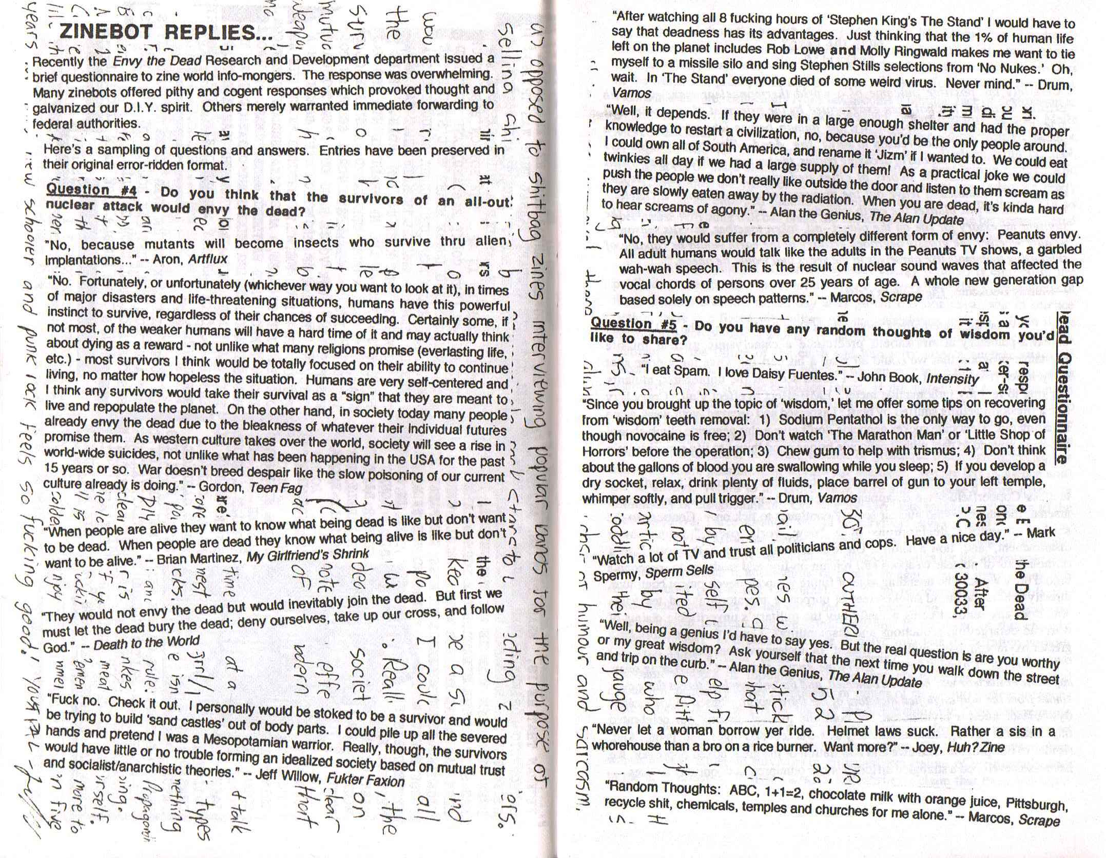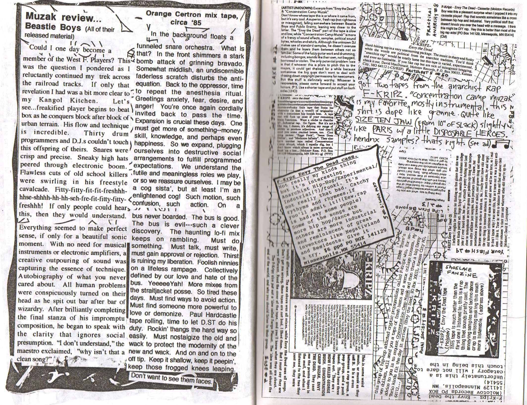 Envy the Dead, Volume 4 was the last of the zines, and it was truly an epic undertaking. Aside from the sheer amount of writing and collaging necessary to flesh out its loosely thematic content (much of it concerned with nuclear holocaust), an extended collating and stapling session around the dining room table — with a crew including Monsieur and the Slickery Eel — remains a memorable stage of its production. Exhorting the reader, “for the sake of peace and stability in Central America…[to] stop the emerging women of country music from crossing over into hip-hop necrophilia,” this, the chunkiest ETD ever, weighed in at nearly 80 pages — not including the Fucksheet Five insert! — and offered “a most unpleasant, unpaginated sensory experience,” indeed.