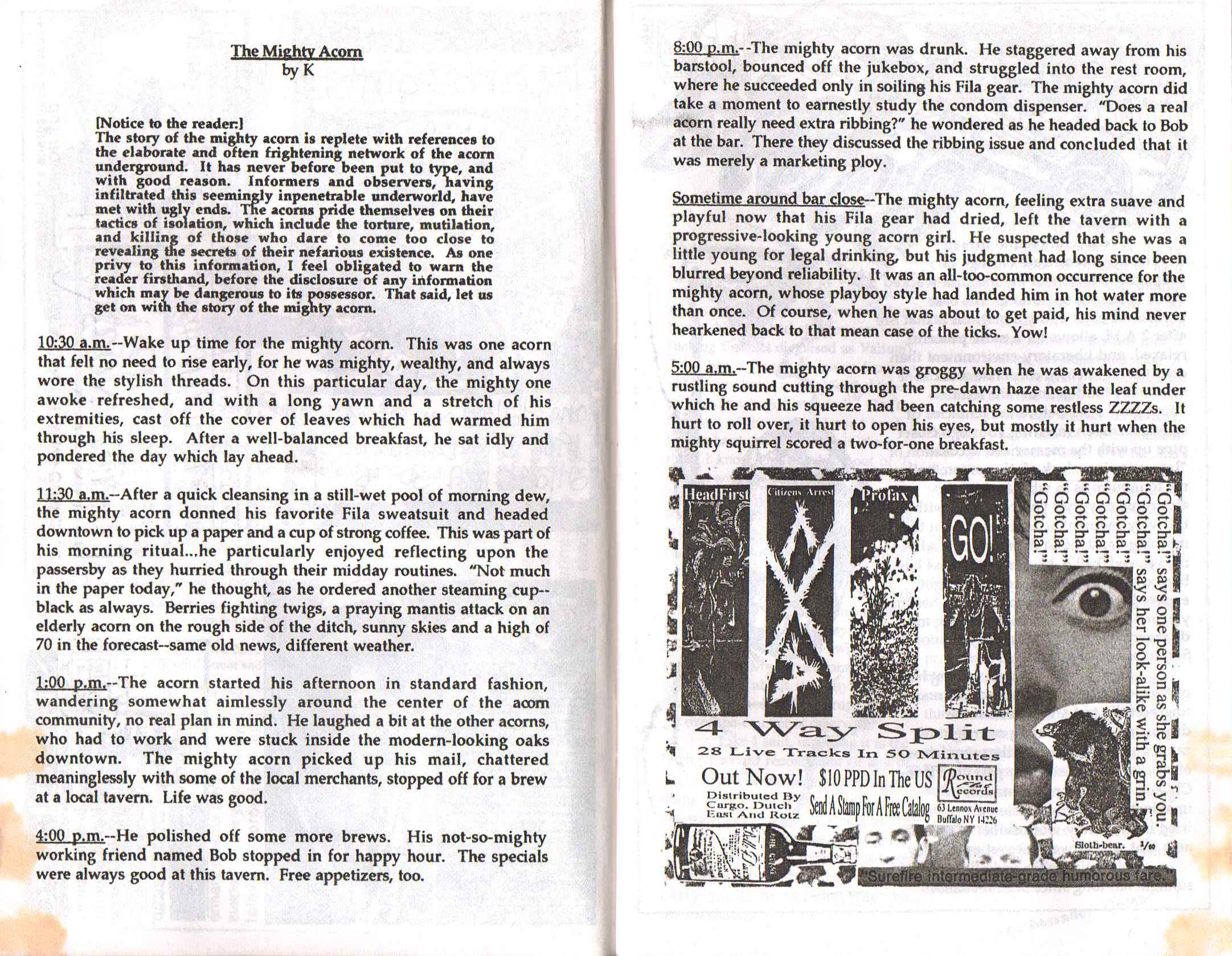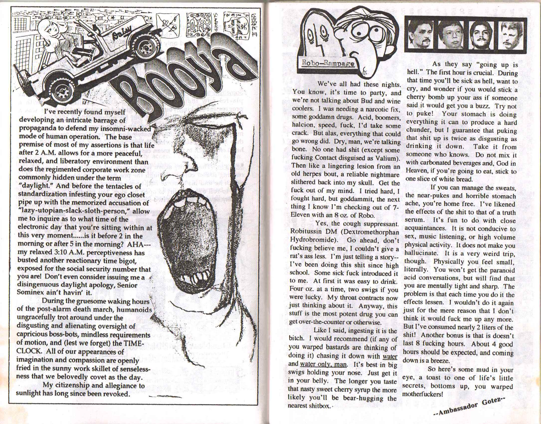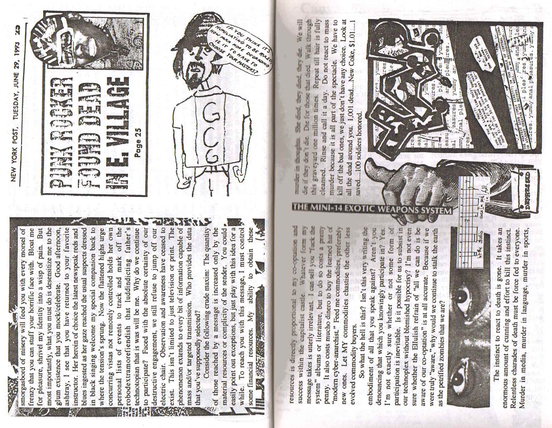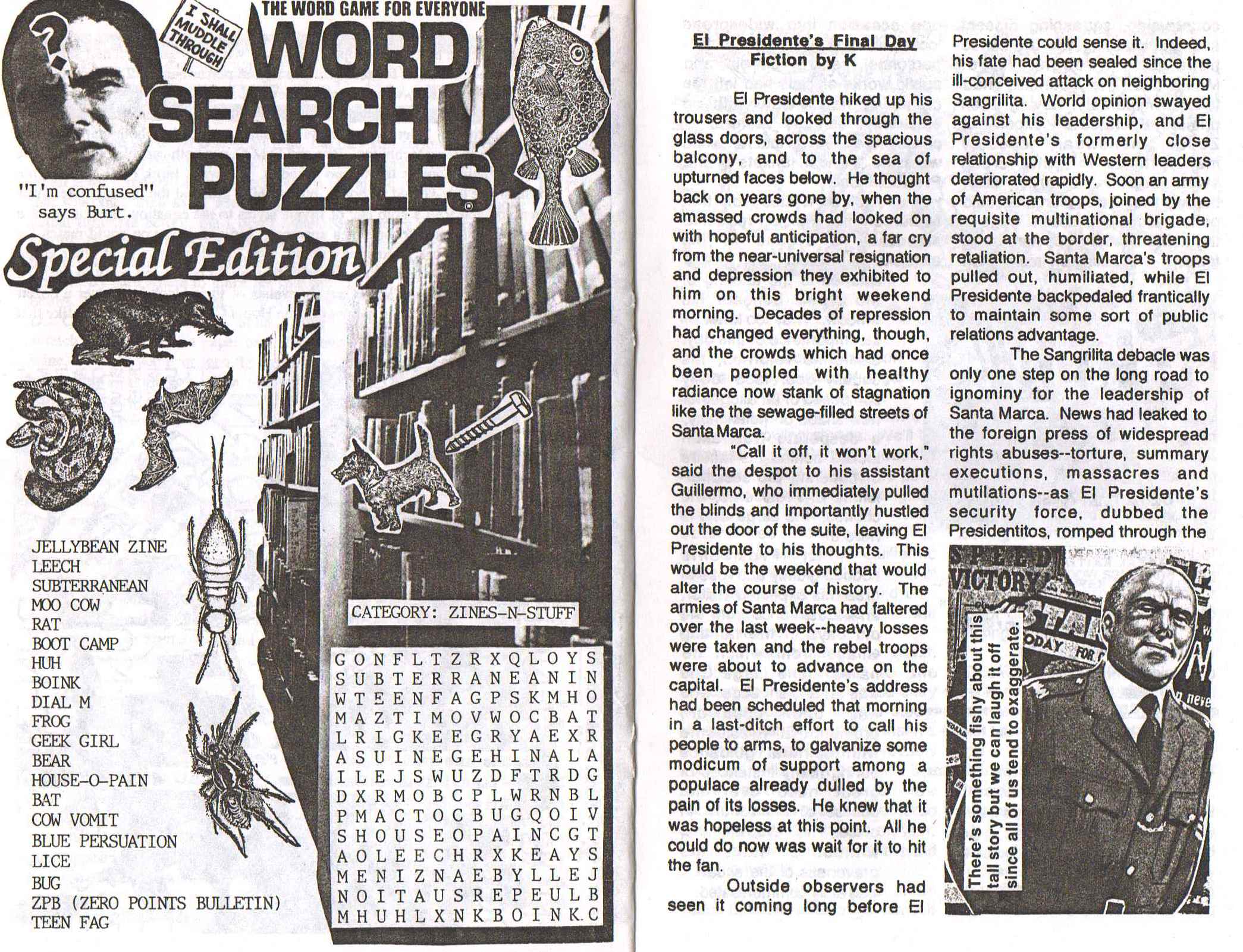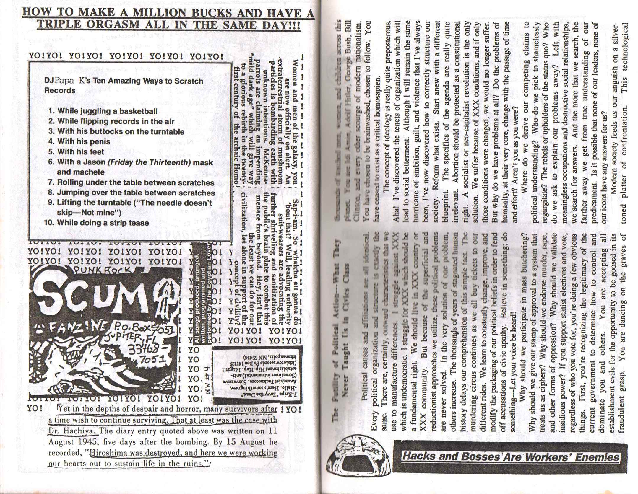 Envy the Dead, Volume 4 was the last of the zines, and it was truly an epic undertaking. Aside from the sheer amount of writing and collaging necessary to flesh out its loosely thematic content (much of it concerned with nuclear holocaust), an extended collating and stapling session around the dining room table — with a crew including Monsieur and the Slickery Eel — remains a memorable stage of its production. Exhorting the reader, “for the sake of peace and stability in Central America…[to] stop the emerging women of country music from crossing over into hip-hop necrophilia,” this, the chunkiest ETD ever, weighed in at nearly 80 pages — not including the Fucksheet Five insert! — and offered “a most unpleasant, unpaginated sensory experience,” indeed.