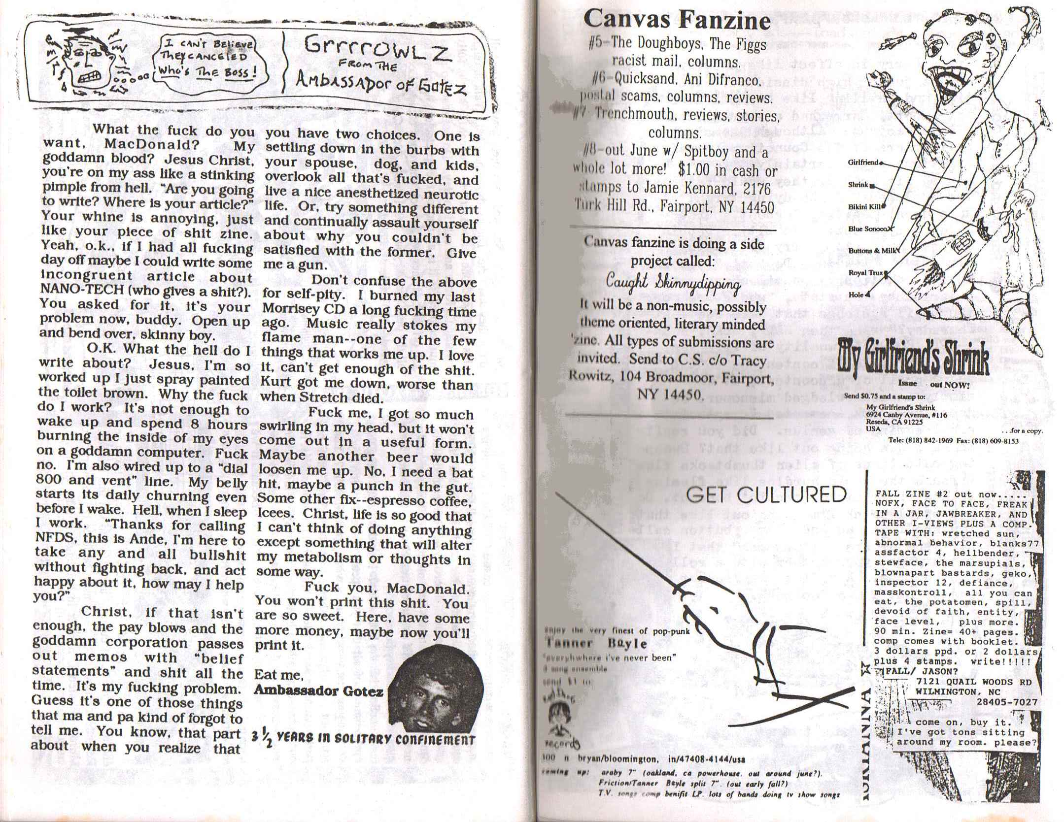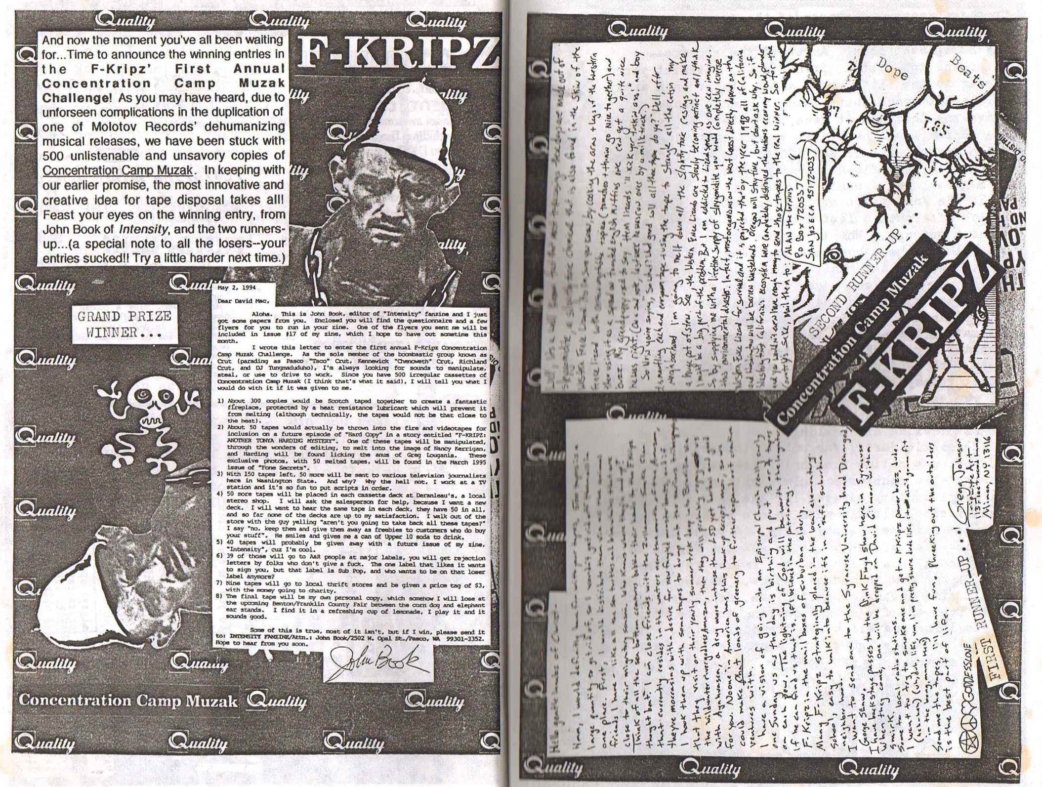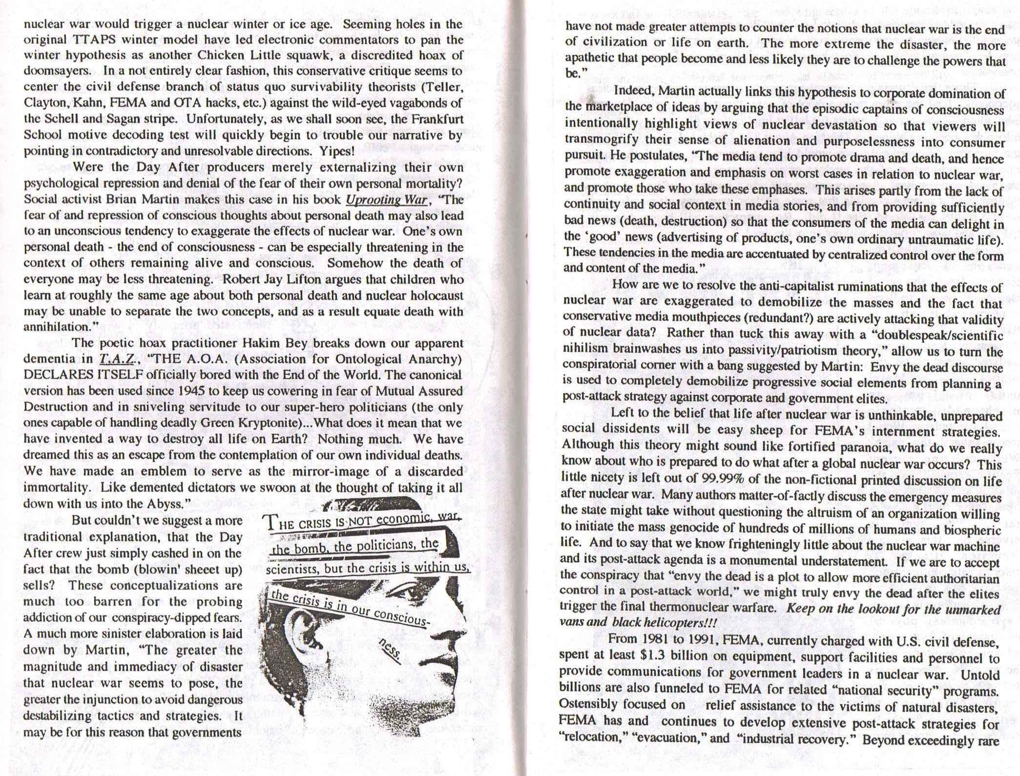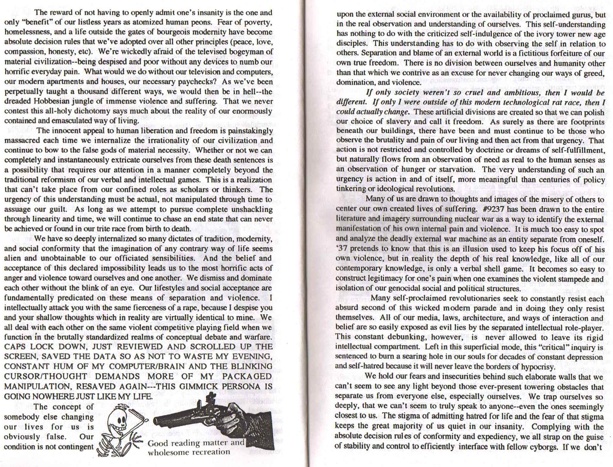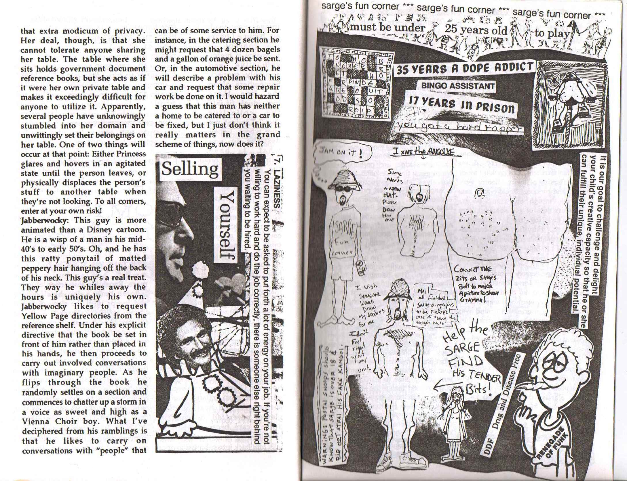 Envy the Dead, Volume 4 was the last of the zines, and it was truly an epic undertaking. Aside from the sheer amount of writing and collaging necessary to flesh out its loosely thematic content (much of it concerned with nuclear holocaust), an extended collating and stapling session around the dining room table — with a crew including Monsieur and the Slickery Eel — remains a memorable stage of its production. Exhorting the reader, “for the sake of peace and stability in Central America…[to] stop the emerging women of country music from crossing over into hip-hop necrophilia,” this, the chunkiest ETD ever, weighed in at nearly 80 pages — not including the Fucksheet Five insert! — and offered “a most unpleasant, unpaginated sensory experience,” indeed.