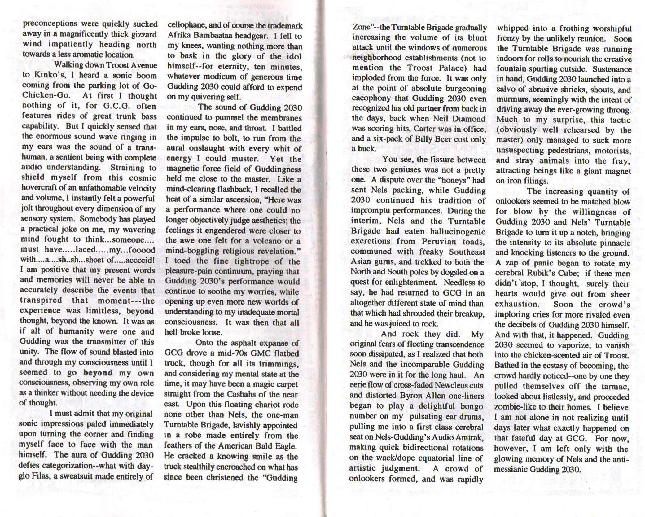 Highlights of ETD4 include another ambitious Mac commentary — this time on the prospects for nuclear apocalypse (here, p. 13) — as well as some cracked Muzak reviews (p. 28) and one of my favorite pieces of ours, a co-written celebration of a fictional show by the mythic “performer” who went by the name of Gudding 2030 (9). (We were going to take the name Gudding 2030 to replace that of F-Kripz on the Puny album, which was under construction at the time of Mac’s death. Those songs never were released, but you can check out the initial mixes under the Puny category on the home page.)